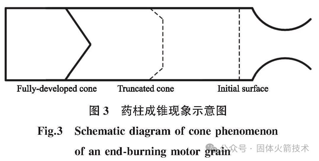 自1971年美国航空喷气固体推进公司观察到固体推进剂药柱成锥现象(如图3所示)以来,国外学者进行了大量的相关研究。BOGGS等发现在壳体粘结的药柱中,径向应变很明显,当应变达到一定值时推进剂燃速将增加,为此设计开展了相关验证实验。